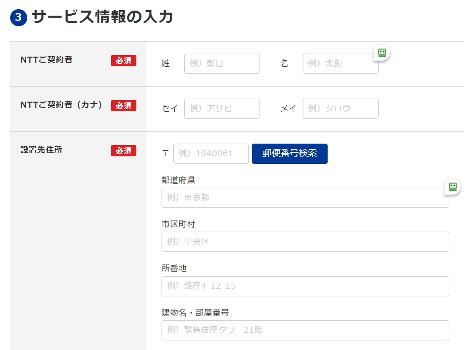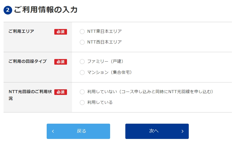 ・ご利用エリア: NTT東日本エリア / NTT西日本エリア ・ご利用の回線タイプ: ファミリー(戸建) / マンション(集合住宅) ・メールアドレスの利用: 利用していない / 利用している