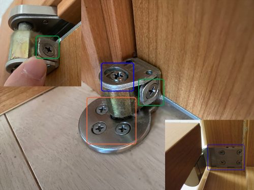 ・左右の調整 = 緑枠のネジの上下同時で調整になります。 ・前後の調整 = オレンジ枠のネジ3つで調整になります。 ・上下の隙間 = 青枠のネジで調整になります。