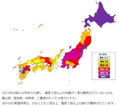 2011年以降で ”震度5弱以上”の地震が発生していない県は 「富山県」「愛知県」「岐阜県」「三重県」の4県のみとなっています。
