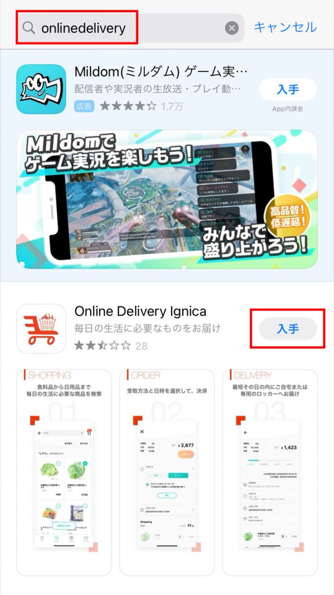 ※ App Storeにて「OnlineDelivery」で検索しますと広告のすぐ下に表示されます。