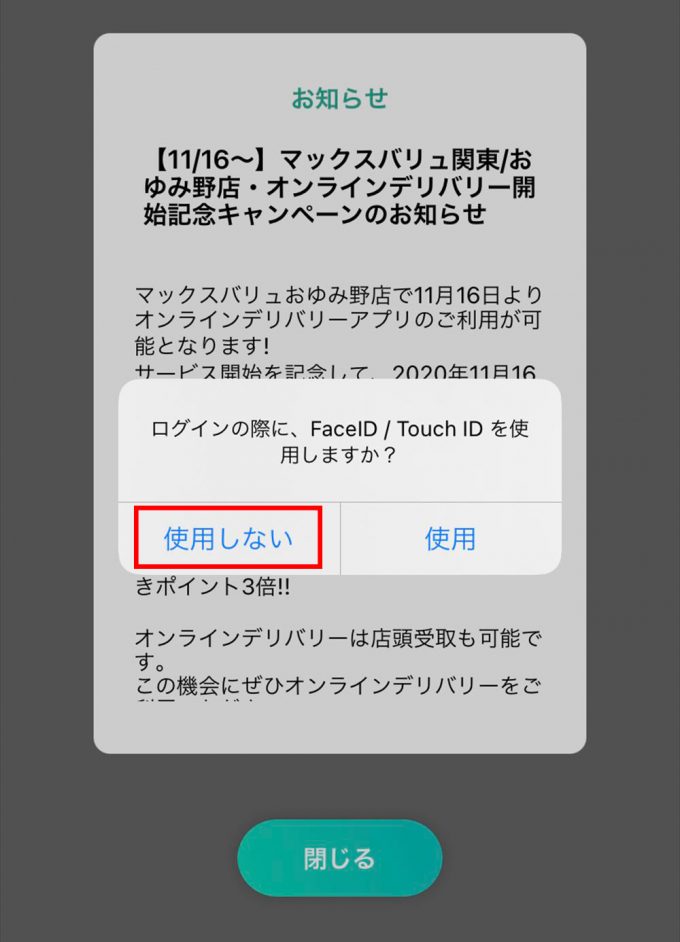 7.ログインの際にFace ID / TouchIDを利用するかどうか尋ねられます。