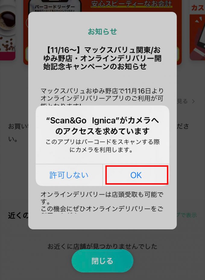 → 通常のキーワード検索だけでなく、自宅にある商品のバーコードスキャンによるラクラク注文をする際に必要になりますので「OK」を選択します。