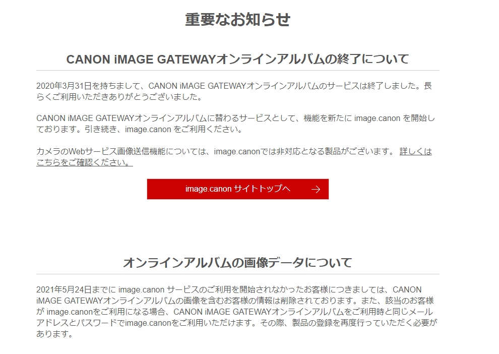 CANON iMAGE GATEWAYオンラインサービスが終了が表示されます。