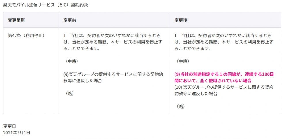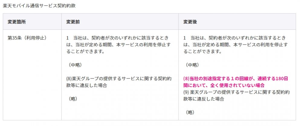 Rakuten UN-LIMIT VIの1回線目において180日間ご利用がなかった場合に、事前に通知した上で当社が利用停止できるよう規約を変更いたします。