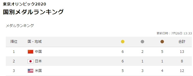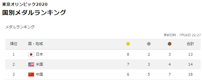 東京オリンピック 日本のメダル獲得ランキングが開始直後からBEST3を維持