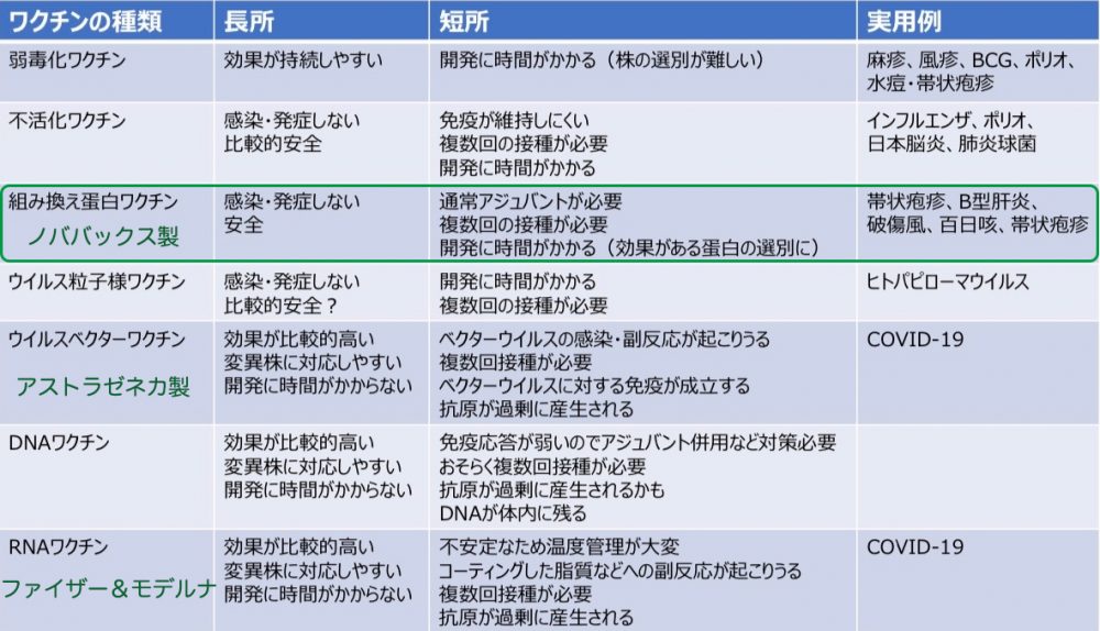・短所: 複数回の接種が必要「開発に時間がかかる」※ 通常アジュバンド(免疫増強剤)が必要