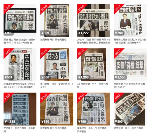 安倍元首相銃撃事件の号外 メルカリで大量転売(売切続出)