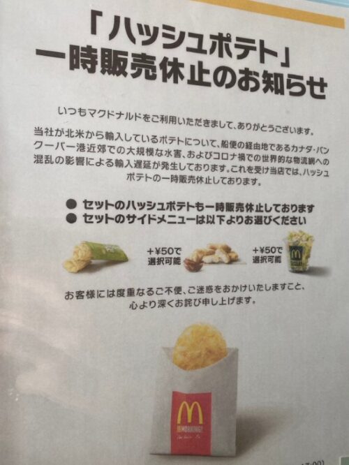 日本マクドナルド 朝マックのハッシュドポテトも一時販売休止と話題